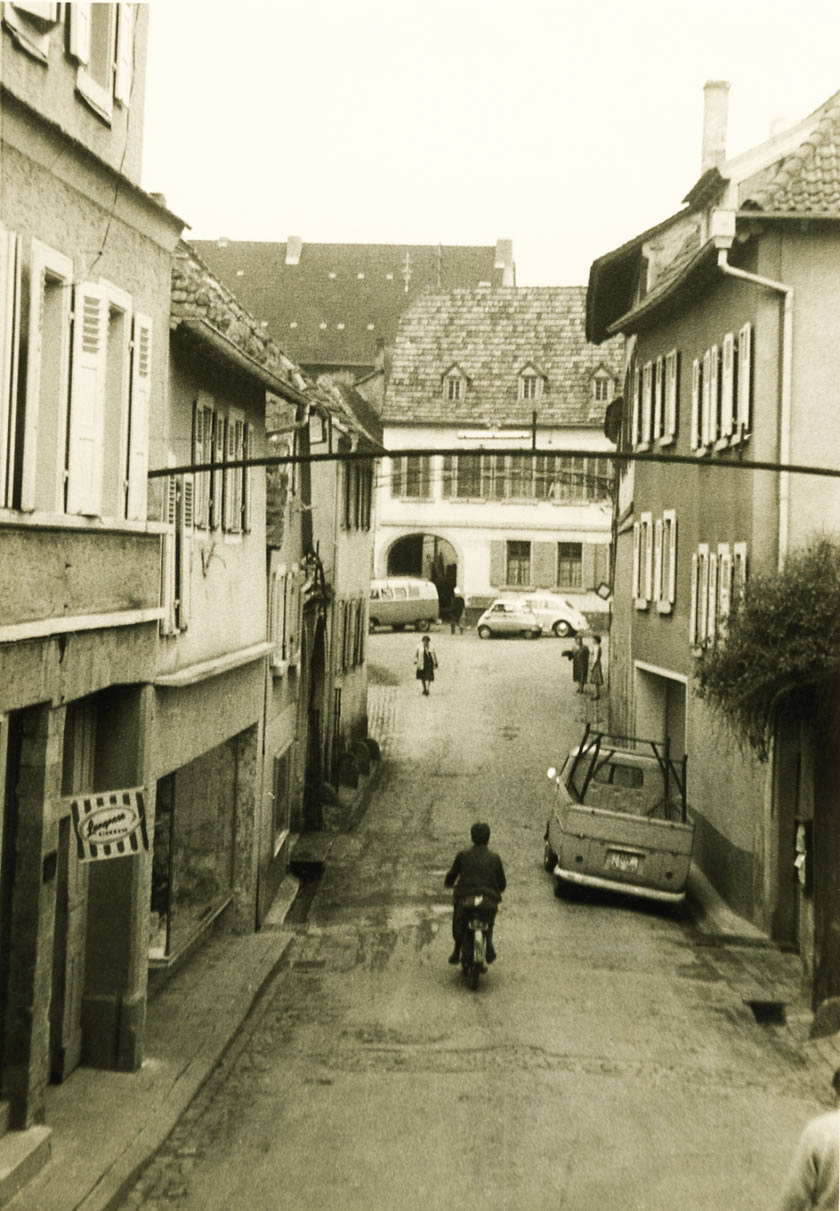 | Blick von unserem Anwesen aus in die Weinstraße hinein in Richtung Dorfplatz, etwa 1967 | ||